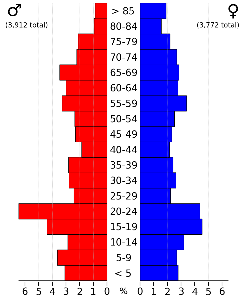 인구의 연령 분포는 18세 미만이 23.0%, 18세에서 24세가 16.3%, 25세에서 44세가 21.6%, 45세에서 64세가 21.5%, 65세 이상이 17.7%였다. 중간 연령은 36세였다. 여성 100명당 남성은 95.7명이었으며, 18세 이상 여성 100명당 남성은 91.9명이었다.