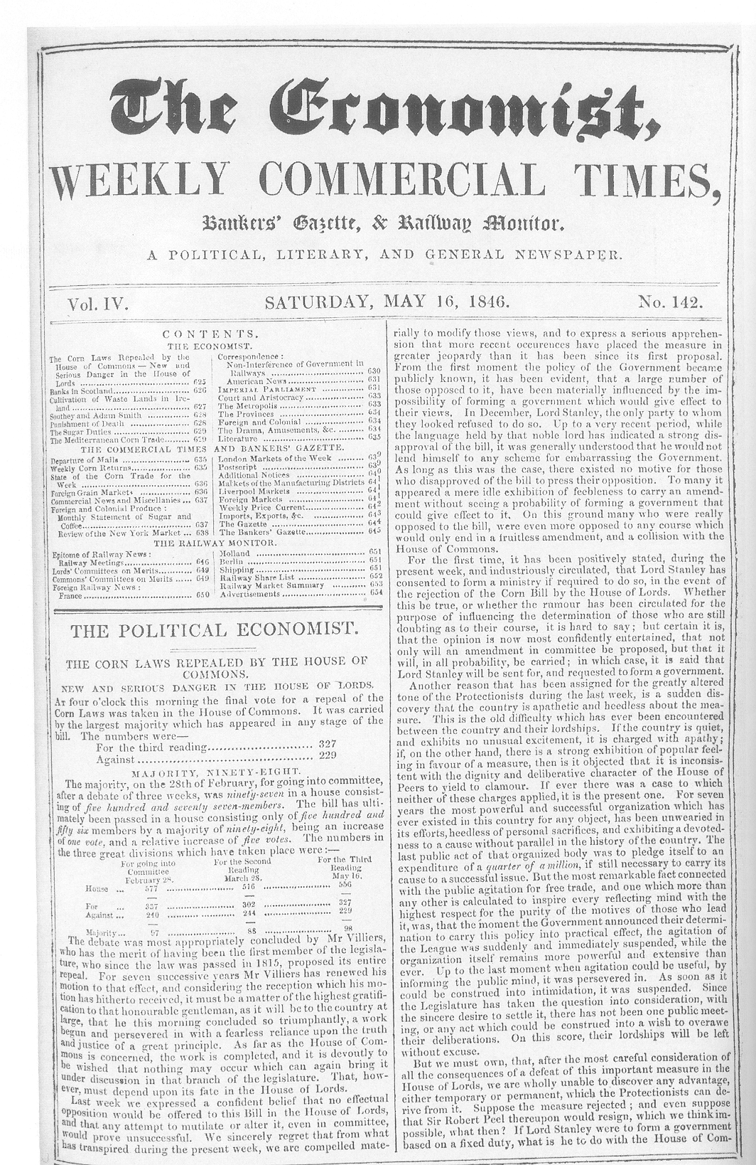 《디 이코노미스트》는 1843년 9월, "우리를 전진하게 하는 지혜와 그 전진을 방해하는 변변치 못한 무지 사이의 맹렬한 논쟁"에 참여하기 위해 창간되었다. 이 설립 취지는 지금도 첫 장에 인쇄되어 발간되고 있다.[1]