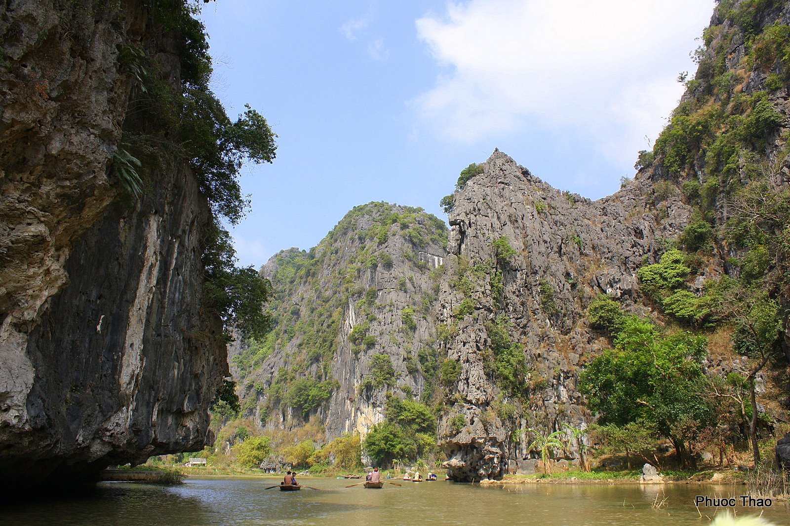 반 람(Ván Lám) 마을에서 작은 보트를 타고 강을 따라 쌀 재배지, 석회암 카르스트 지형을 지나 동굴을 통과하여 다시 돌아오는 코스가 일반적이다. 현지 여성들이 안내를 맡고, 탑승객들에게 자수 제품을 판매하려 한다. 안내원들은 발로 배를 젓는 것으로 유명하다.[4]