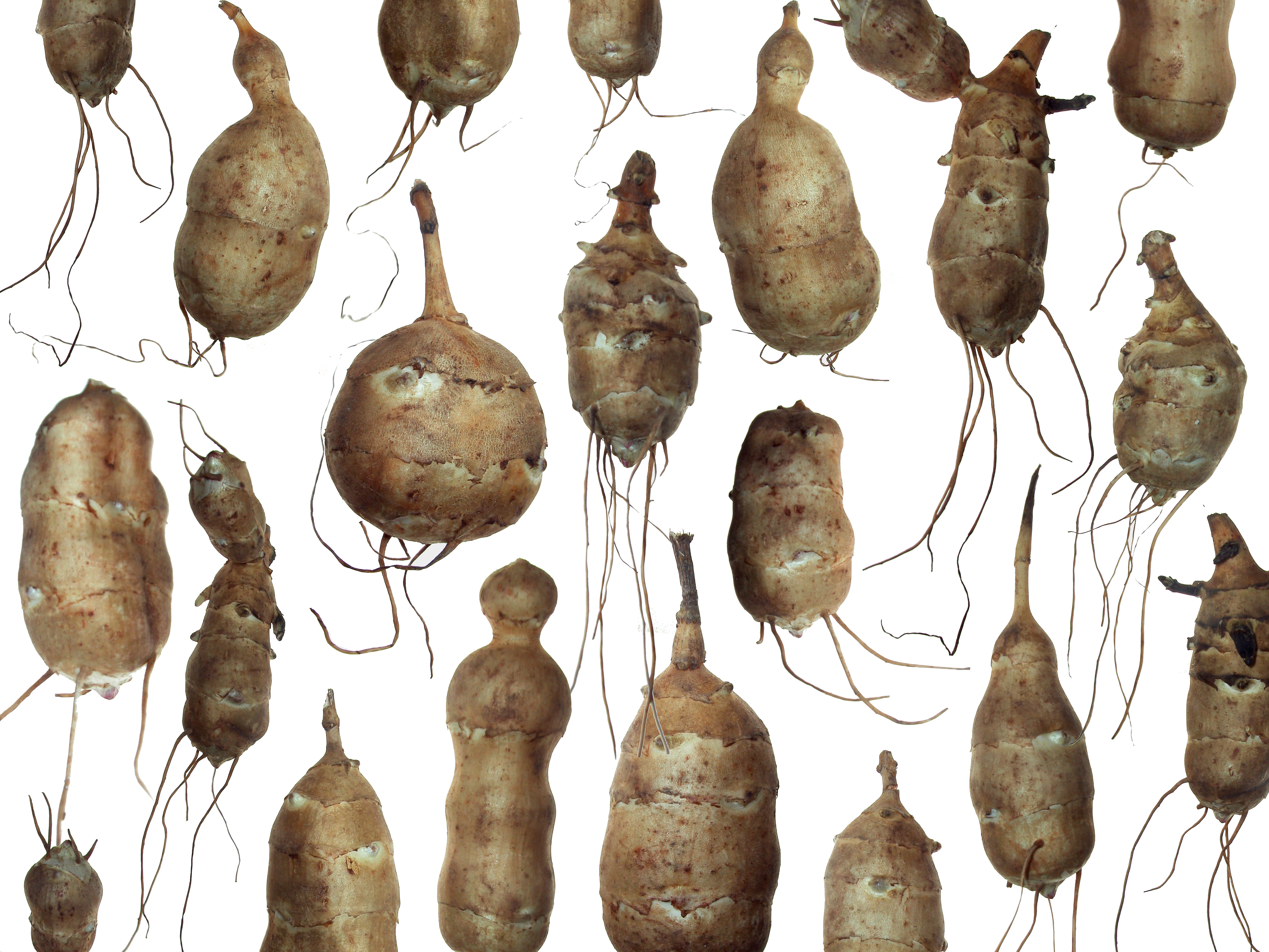 덩이줄기는 길쭉하고 불규칙한 모양이며, 옅은 갈색에서 흰색, 빨간색, 보라색 등 다양한 색상을 띤다.[6][8] 덩이줄기는 7.5cm에서 10cm 길이에 3cm에서 5cm 두께를 가지며, 날것으로 먹으면 아삭아삭한 질감으로 외관상 생강 뿌리와 비슷하다.[6][8]