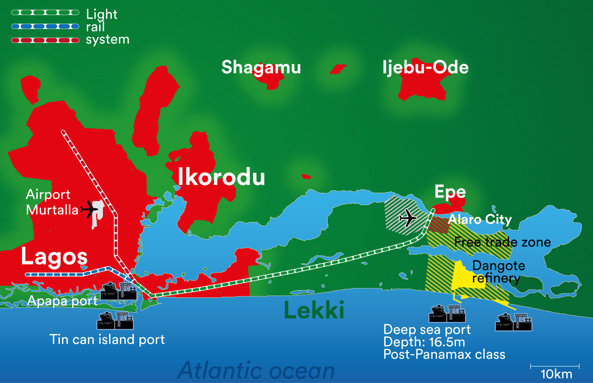 1970년대 나이지리아 석유 호황 이후 라고스는 인구 폭발과 경제 성장, 농촌 이주를 경험하며 외곽 마을과 정착지가 급속히 발전하여 현재의 "라고스 대도시권"을 형성했다.[53] 2006년까지 라고스 주변의 대도시권은 라고스 주 경계를 넘어 메가시티 지위에 도달했다. 이 지역은 "대 라고스 대도시권"으로 불리며, 라고스 주 동부 및 서부 도시 경계 옆, 북쪽 경계 너머에 있는 인접한 오군 주의 일부 LGA를 포함한다.[45]