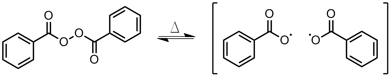 : 개시제가 호몰리시스 방식으로 결합이 절단될 때까지 가열하여 두 개의 라디칼을 생성한다. 이 방법은 유기 과산화물 또는 아조 화합물과 함께 가장 자주 사용된다.[2]