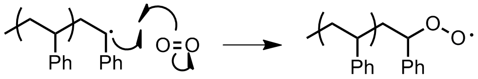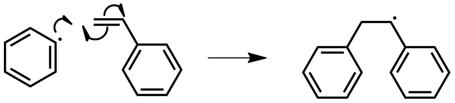 ''그림 11'': 과산화 벤조일(BPO)에서 유래된 페닐 개시제가 폴리머 사슬을 시작하기 위해 스티렌 분자를 공격한다.