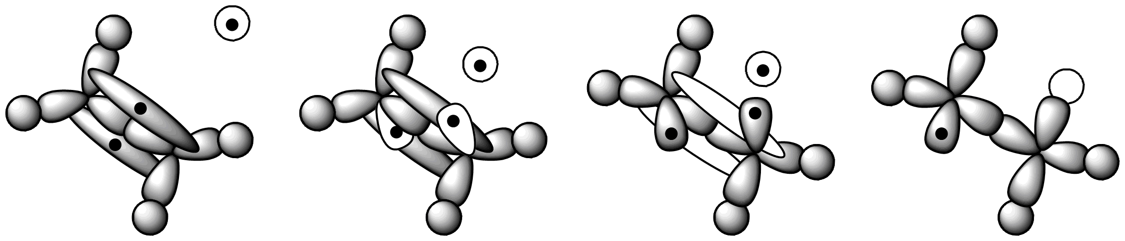 ''그림 12'': 에틸렌 분자에 대한 개시제의 공격에 대한 오비탈 그림으로, 폴리에틸렌 사슬의 시작을 생성한다.