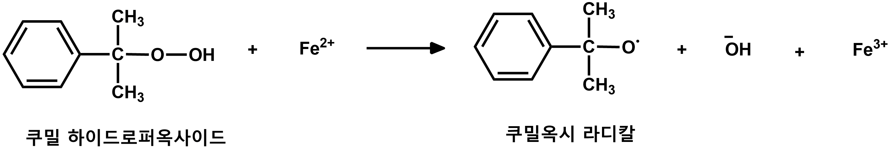 산화 환원 반응은 낮은 온도(보통 50℃ 이하)에서 자유 라디칼 중합을 할 때 유용하다. 예를 들어, Fe^2+ 이온이 쿠밀 과산화 수소의 OH기 산소 원자에 전자를 제공하고, 인접한 O-O 과산화 결합은 균형 분해된다. 즉, OH기의 산소 원자는 두 번째 전자를 받아 수산화 이온(OH-)이 되고, 과산화 결합에서 남은 산소 원자는 과산화 결합 전자를 받아 쿠밀옥시 라디칼이 된다.[38]