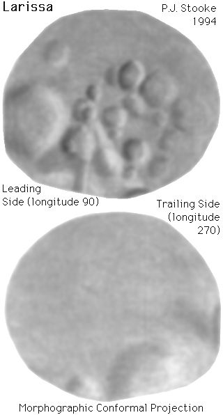 라리사는 해왕성의 네 번째로 큰 위성이다. 비정상적인(비구형) 모양이며 심하게 크레이터로 뒤덮여 있고, 지질학적 변화의 징후는 보이지 않는다.[20] 트리톤 안쪽의 다른 위성들과 마찬가지로, 해왕성의 원래 위성의 파편이 잔해 더미로 재강착된 것으로 보인다. 이는 트리톤이 매우 이심률이 큰 초기 궤도로 포획된 직후 트리톤의 섭동에 의해 파괴되었다.[20]