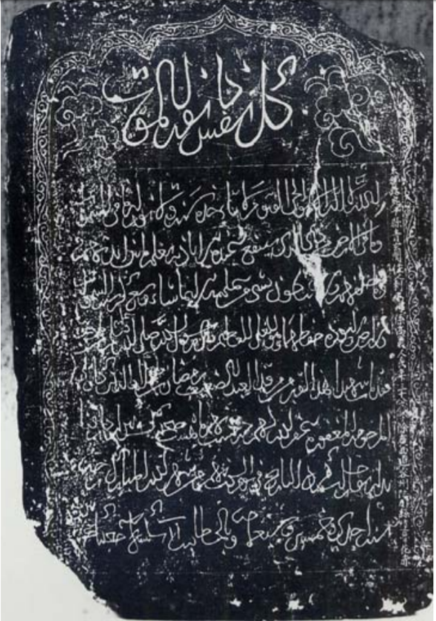 아랍어 비문은 이슬람 장례식 비문의 형식을 따른다. 쿠란 3장 185절 "모든 영혼은 죽음을 맛보리라"라는 문구를 제목으로 사용하며, 왕좌의 구절을 인용하고 라마단에 대한 세부 사항을 덧붙인다.[3]
