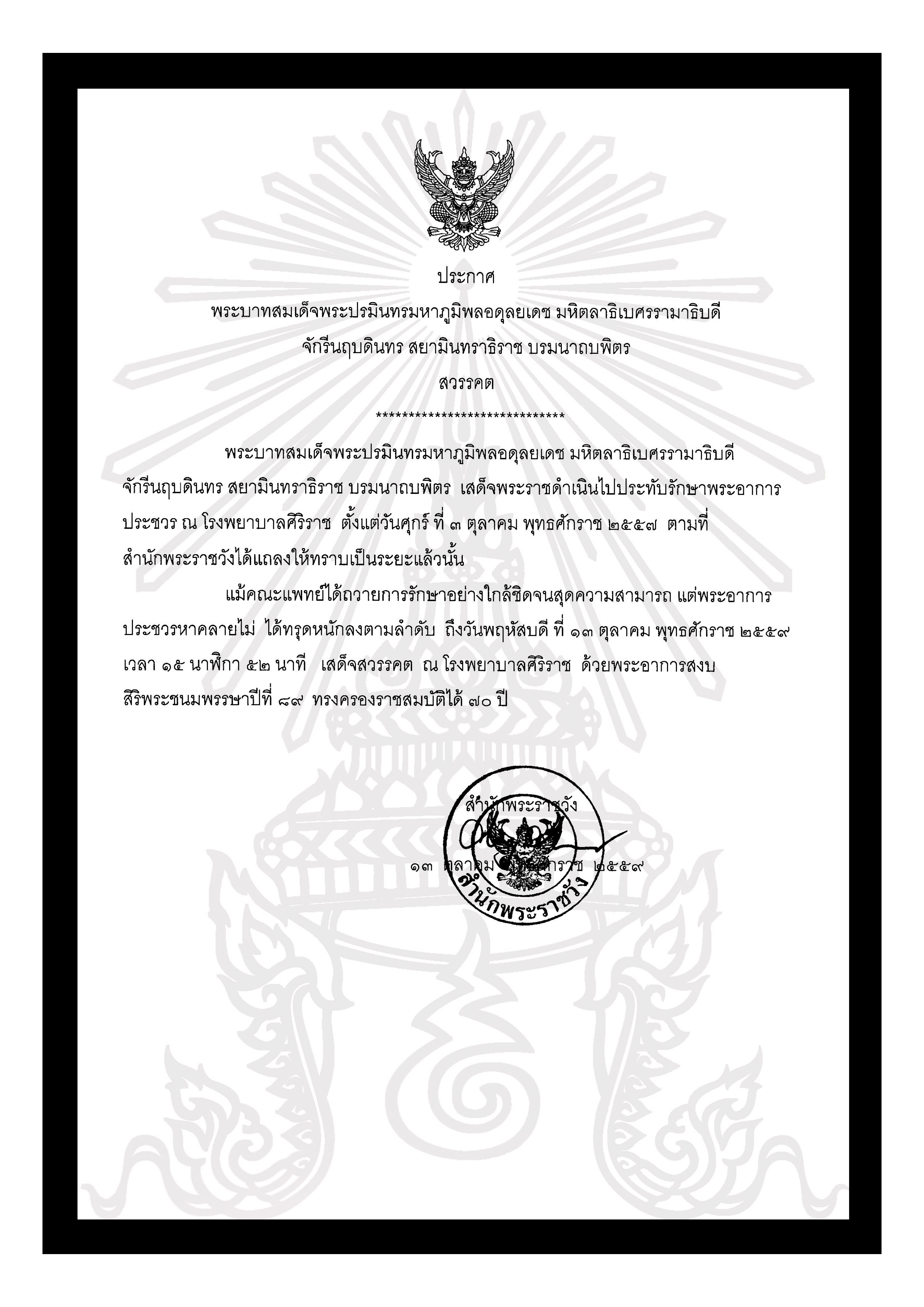 2016년 10월 13일 오후 3시 52분(현지 시간), 시리랏 병원에서 88세를 일기로 붕어했다. 재위 기간은 70년 4개월로, 역사적으로도 드물게 긴 기간이었다.[186][187][188]。