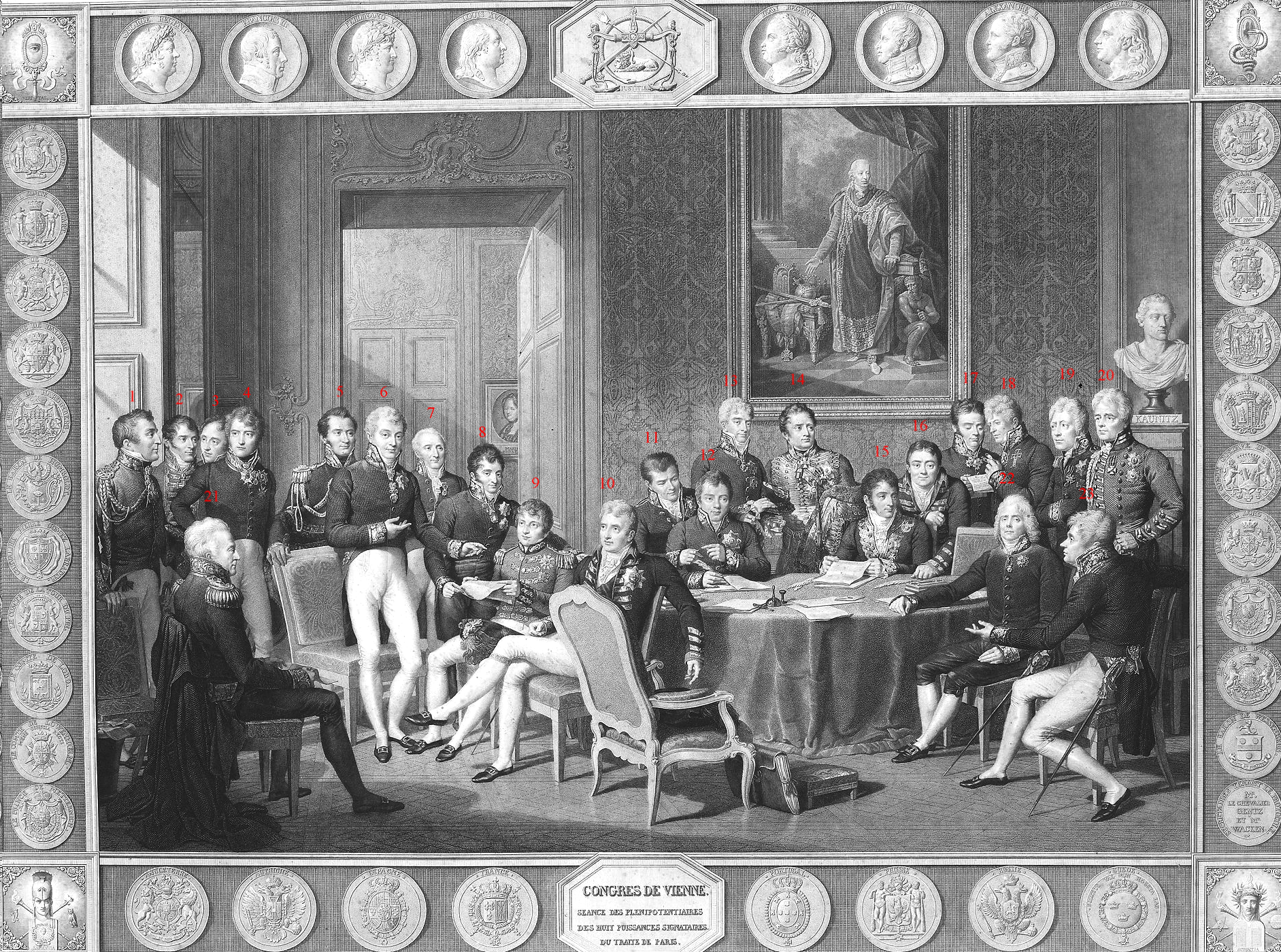 빈 회의. 라브라도 후작은 앉아있는 외교관들 중 오른쪽에서 세 번째 둥근 테이블에 앉아있다.