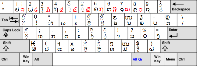 Windows의 라오어 키보드 배열은 다음과 같다.[18]