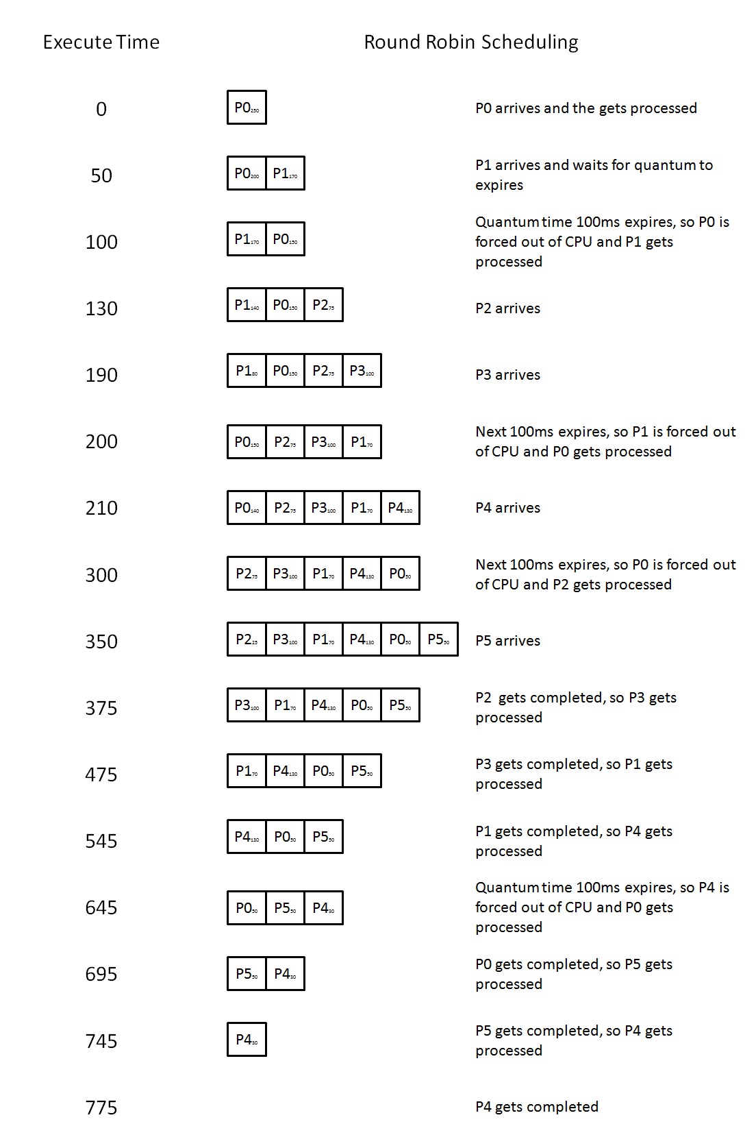 라운드 로빈 스케줄링을 이해하기 위해 퀀텀 시간이 100ms인 프로세스의 도착 시간과 실행 시간을 다음 표로 나타내었다.