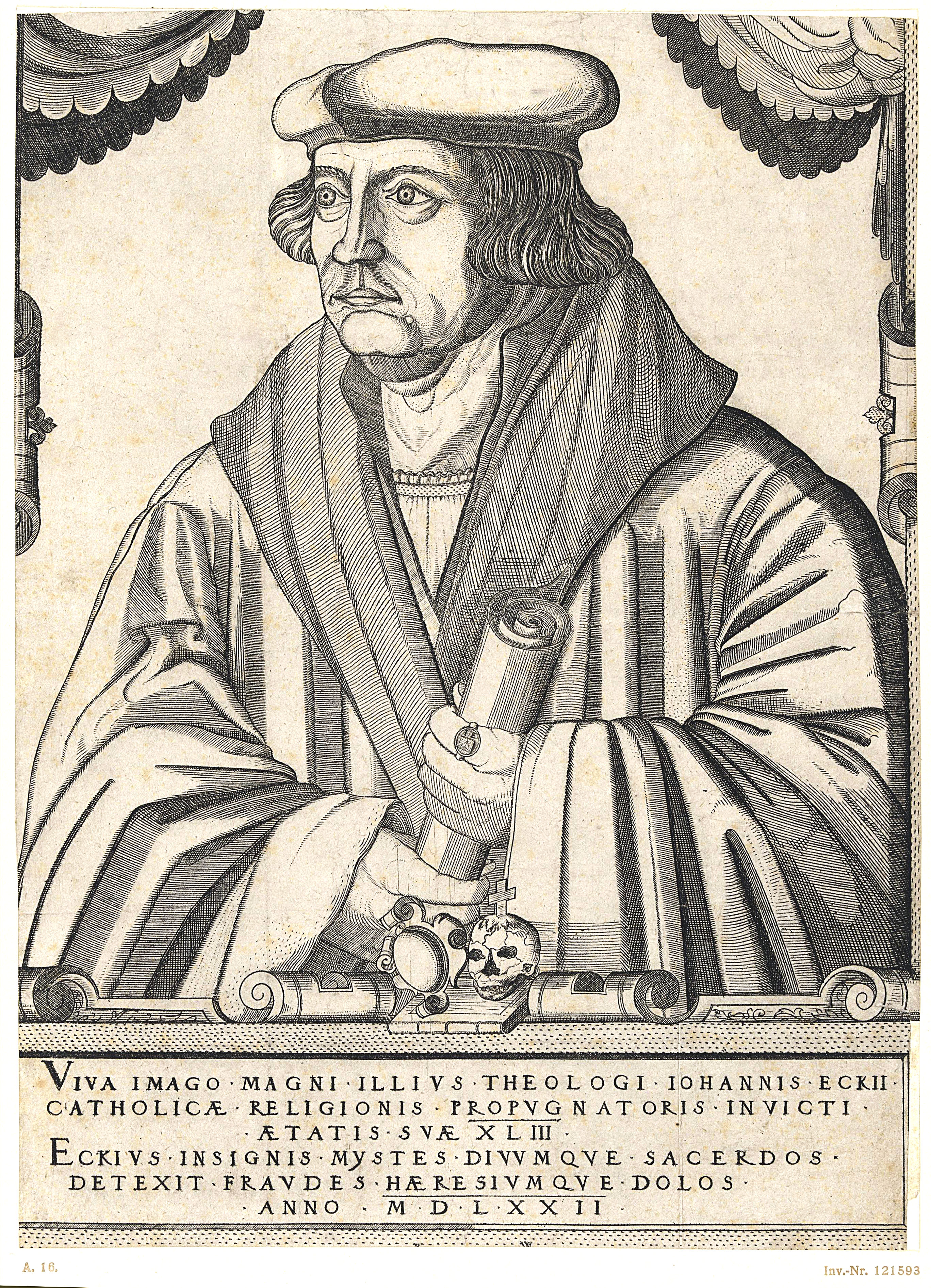 요한 에크는 독일의 가톨릭 사제이자 신학자로, 잉골슈타트 대학교의 신학 교수로서 대학을 가톨릭 거점으로 만들고 마르틴 루터의 종교 개혁에 반대하며 라이프치히 논쟁에 참여했으며, 교황의 권위를 옹호하고 종교 재판관으로 활동하며 이단 박해에 앞장섰다. - 라이프치히 논쟁 - 마르틴 루터