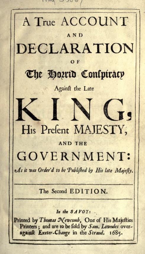 연루 의심: 먼머스 공작 제임스 스콧, 아서 카펠 남작, 윌리엄 러셀, 에식스 백작
