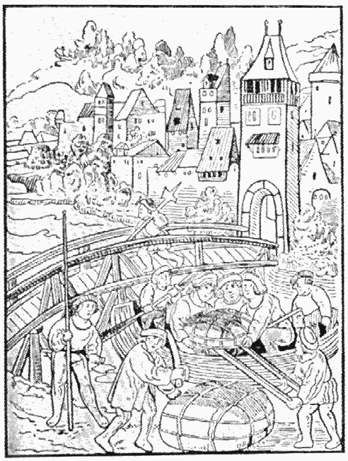 1484년 디볼트 실링의 "Schweizerchronik"에서 라인펠덴 문 근처에서 배에 싣는 모습. 라인은 항상 라인펠덴의 발전에 중추적인 역할을 해왔다.