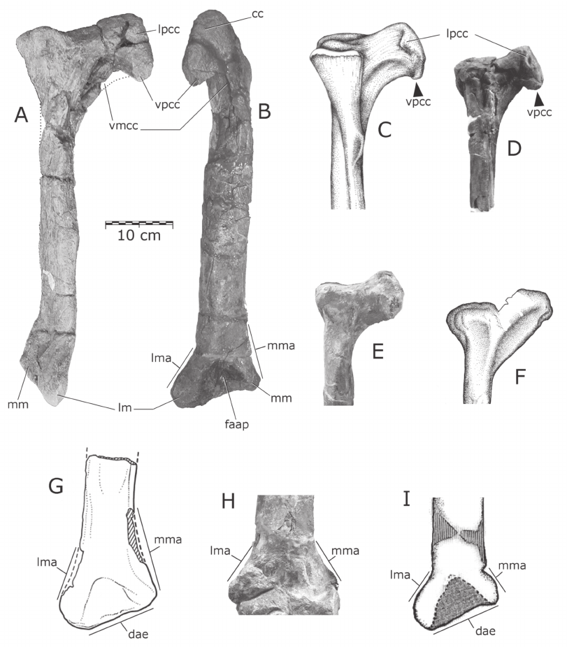 좌골에 부착하기 위해 튀어나온 골반의 부분인 좌골돌기는 치골돌기보다 더 멀리 튀어나와 있어 비구가 골반의 뒤쪽 아래쪽으로 더 멀리 위치하게 한다. 좌골과 치골 반대편에 있는 장골 능선은 골반 관절 부위에 비해 얇으며 각각 1cm 에서 8cm의 두께를 가지고 있다. 비골은 무릎 아래 다리 하단의 바깥쪽에 위치하며, 위에서 아래로 폭이 감소하고 약간 오목하다. ''세라토사우루스''와 유사하게, 중족골 2번 뼈는 발목 뼈를 두 번째 발가락에 연결하며, 튼튼하고, 타원형이며, 발목과 연결되는 부분이 약간 오목하며, 폭이 발가락에 가까워질수록 감소하지 않는다. 중족골 4번 뼈는 중족골 2번 뼈와 유사한 비율을 가지고 있다. 두 개의 중족골 2번 뼈가 보존되어 있으며, 왼쪽의 중족골 4번 뼈만 보존되어 있다.[2]