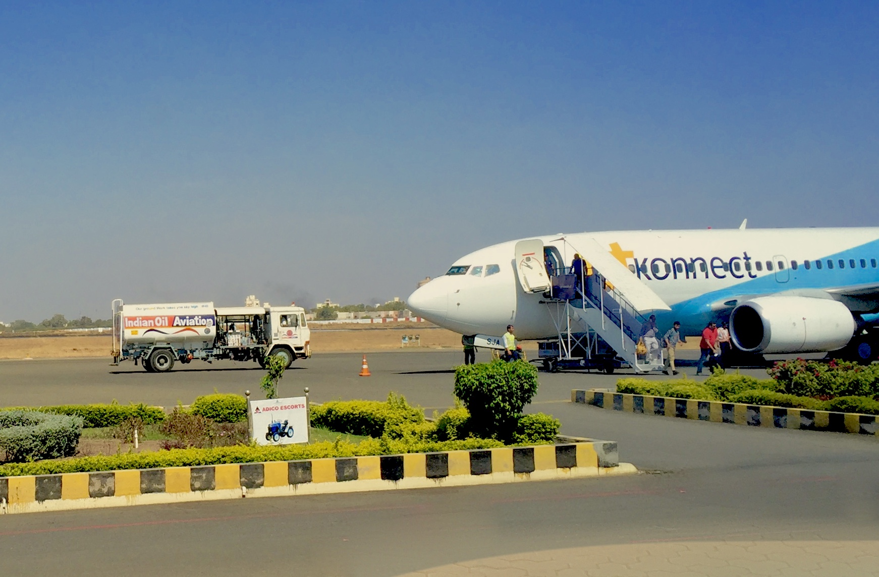 라지코트 공항 활주로에 있는 항공기와 급유 트럭