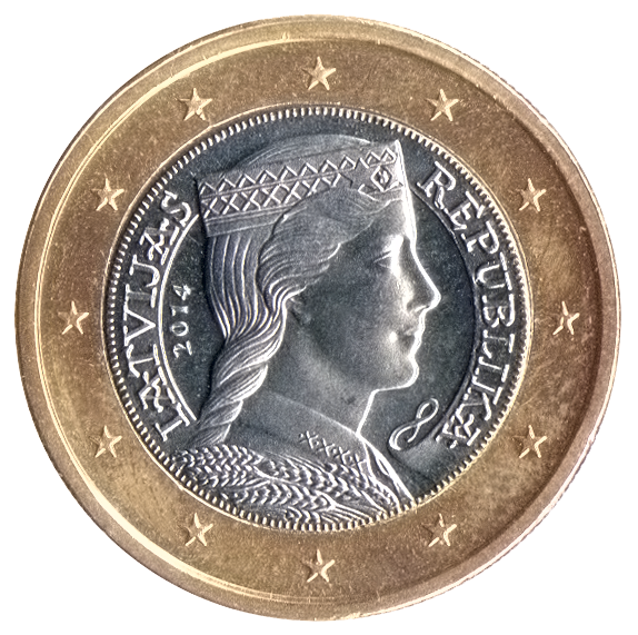 - 1, 2유로 주화: 제2차 세계 대전 이전 5 라츠 주화에 등장했던 라트비아의 처녀