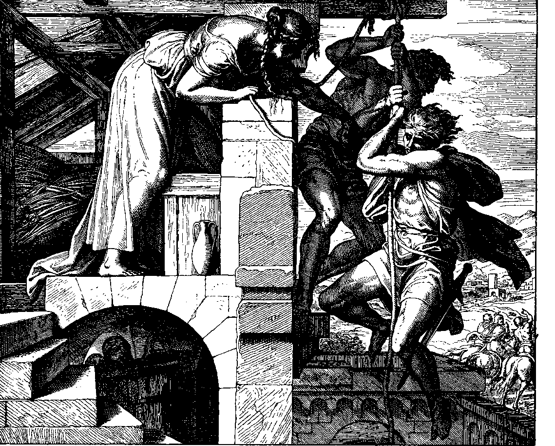 여호수아기에 따르면,[16] 히브리인들이 아라바 또는 요르단강 건너편 예리코 맞은편에 있는 싯딤에 진을 치고 강을 건너갈 준비를 하고 있을 때, 여호수아는 마지막 준비로 예리코의 군사력을 조사하기 위해 두 명의 정탐꾼을 보냈다. 정탐꾼들은 라합의 집에 머물렀는데, 그 집은 성벽에 지어져 있었다. 정탐꾼을 잡기 위해 파견된 병사들은 라합에게 정탐꾼들을 끌어내라고 요구했다.[17] 그러나 그녀는 정탐꾼들을 지붕의 삼 묶음 밑에 숨겼다. 그 때는 보리 수확철이었고, 요르단 계곡에서는 삼과 보리가 동시에 익기 때문에 "그 때 삼 줄기 묶음을 말리고 있었을 것이다".[18]