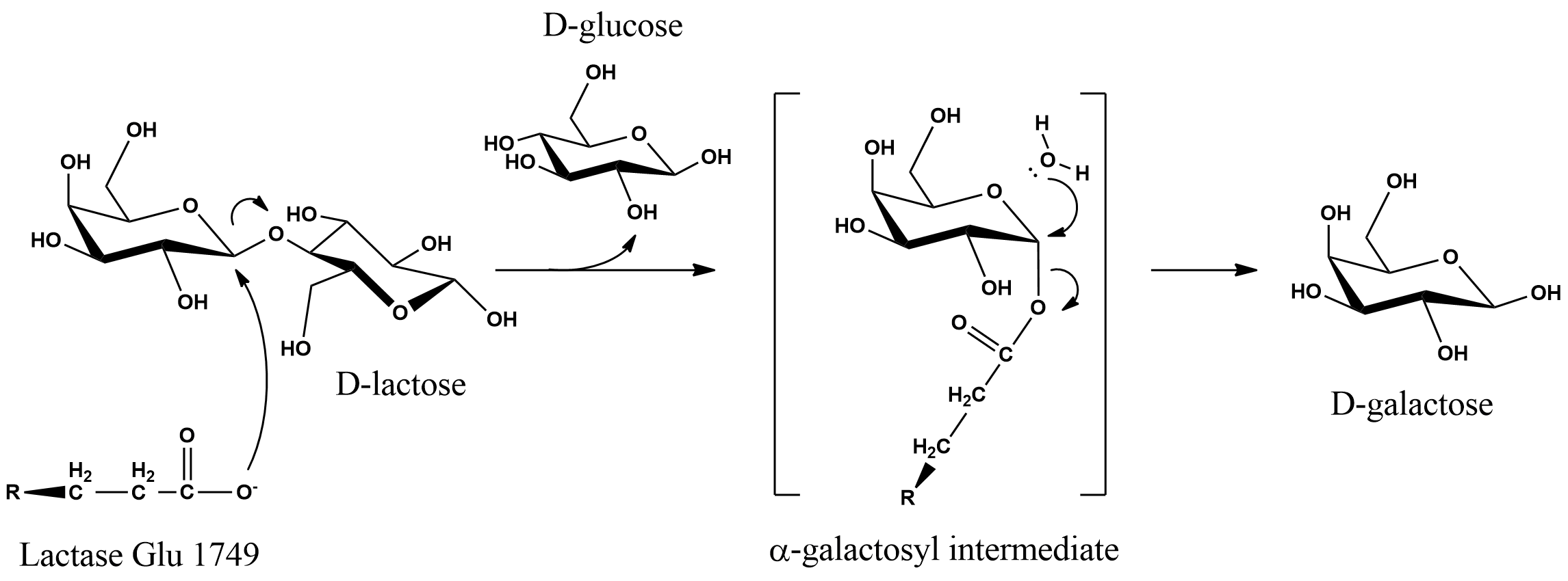 D-젖당 가수분해의 촉매 메커니즘은 생성물에서 기질의 아노머 구성을 유지한다.[15] 메커니즘의 세부 사항은 불확실하지만, 입체 화학적 유지는 이중 치환 반응을 통해 달성된다. ''대장균''(E. coli) 락테이스 연구에 따르면, 가수분해는 효소의 글루탐산 염기성 친핵체가 β-글리코사이드 결합에서 갈락토실 탄소의 축 방향에서 공격할 때 시작된다.[16] D-포도당 이탈기의 제거는 Mg 의존성 산 촉매 작용에 의해 촉진될 수 있다.[2] 효소는 물에 의한 적도 친핵성 공격 시 α-갈락토실 부분으로부터 해리되어 D-갈락토스를 생성한다.[2]