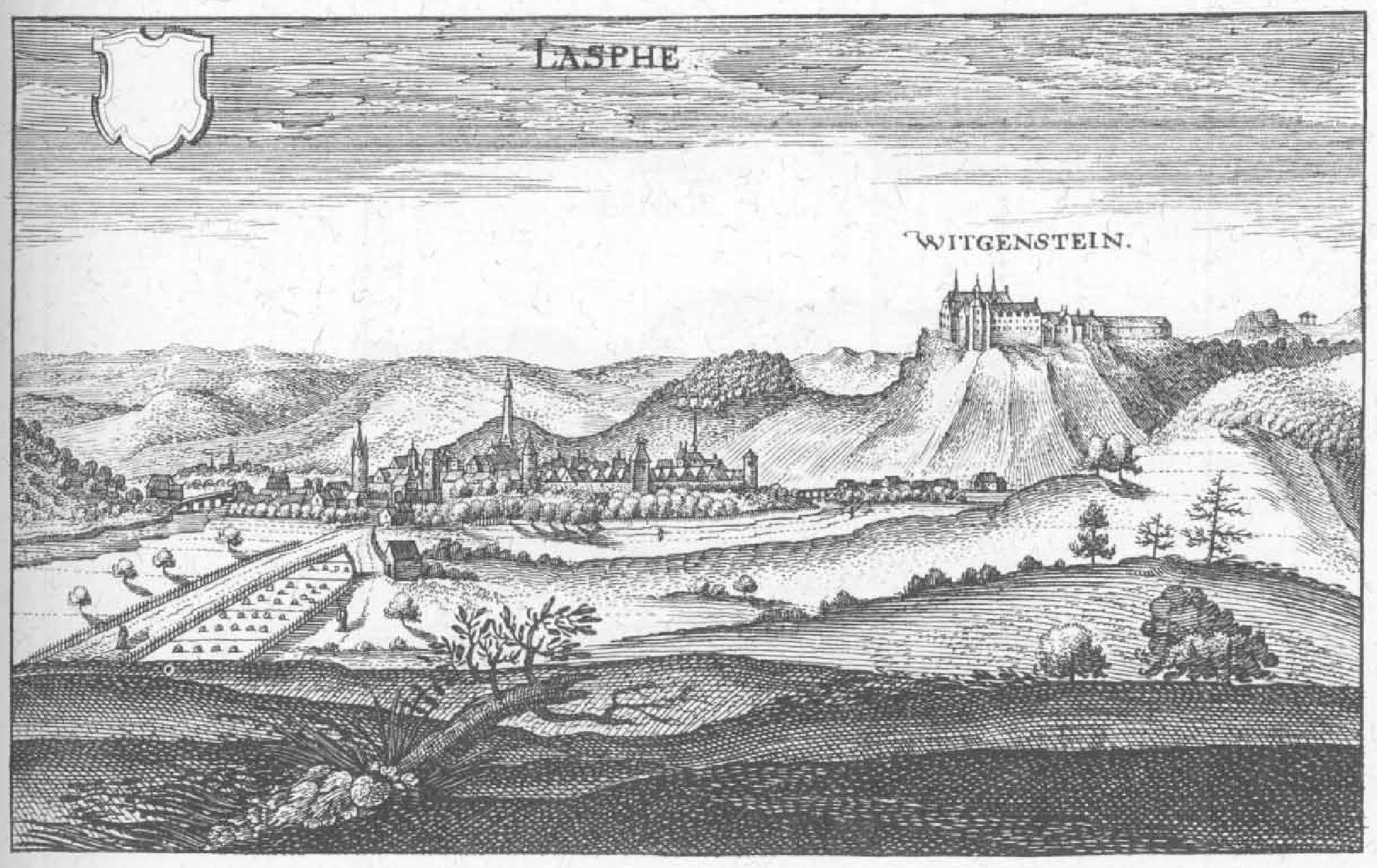 1655년 마테우스 메리안의 "헤세 지형도"에 나타난 바트 라스페 부근의 상부 란 계곡