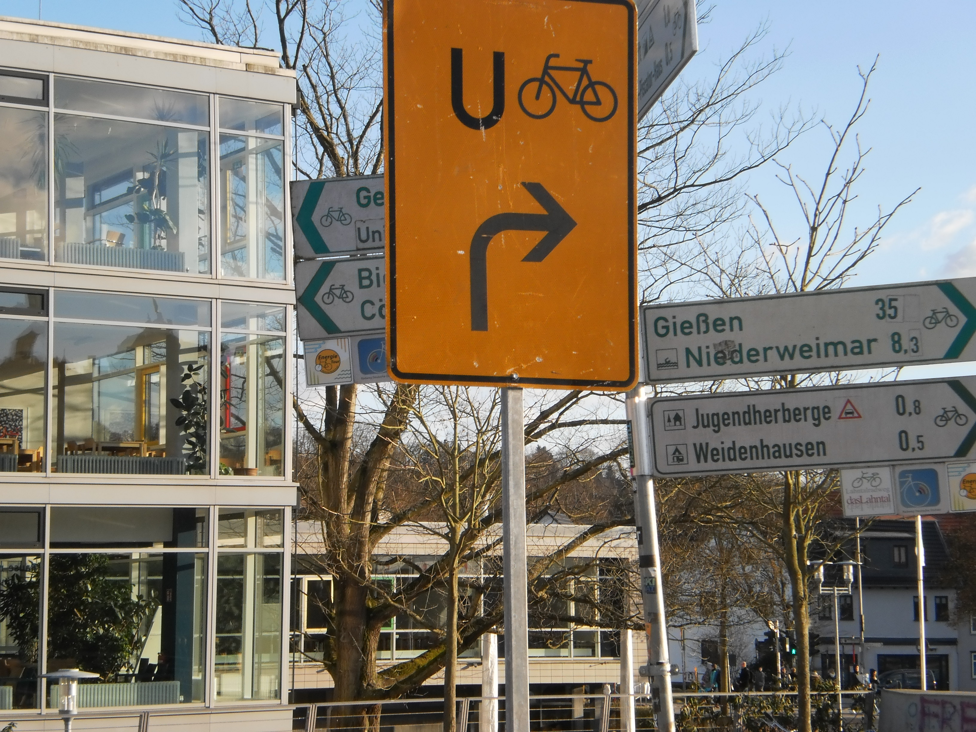 마르부르크 대학교 카페테리아에서 라인강둑을 따라 북쪽과 남쪽으로 이어지는 '란탈라드베크' 자전거 도로 표지판 (2017년 3월)