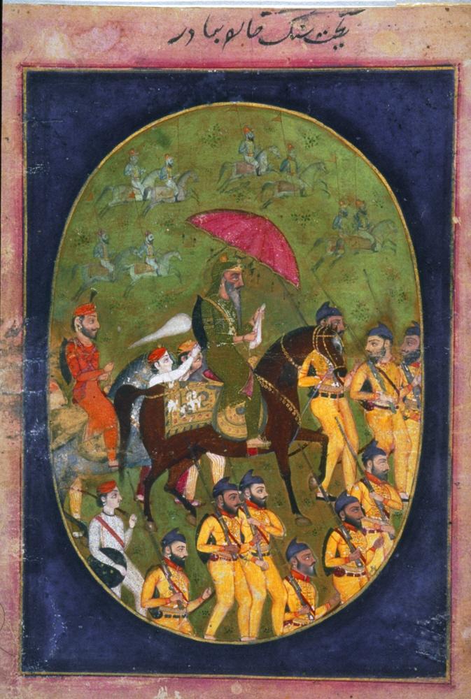 무굴 제국은 1707년 아우랑제브 사망 이후 붕괴되어 인도 아대륙 대부분 지역에 대한 통치 능력이 쇠퇴했다. 특히 펀자브 지역을 포함한 북서부 지역에서는 구루 고빈드 싱이 설립한 펀자브 시크교도 전사 집단인 칼사의 등장으로 인해 무굴 제국의 권력이 더욱 쇠퇴했다.[18] 아프가니스탄인들의 약탈이 인더스 강 유역을 공격했지만, 칼사 시크교도들의 조직된 군대와 민병대의 저항에 직면했다. 시크교도들은 이전의 무슬림 세금징수인들을 대체하여 자신들의 자민다르를 임명했고, 이는 시크교도들의 이익에 부합하는 전사들을 지원하고 강화하는 데 필요한 자원을 제공했다.[18] 한편, 식민지 무역업자들과 동인도 회사는 인도의 동해안과 서해안에서 활동을 시작했다.[18]