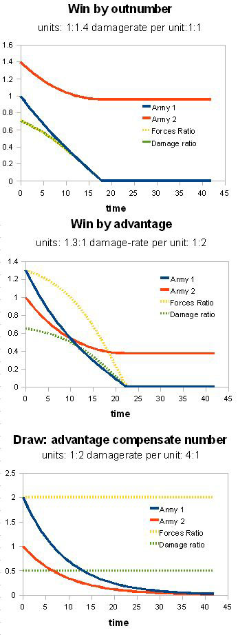 검 등의 무기로 싸우는 고전적인 전투에서는 아군 한 명이 적군 한 명을 저격하는 방식이므로, 시간 내의 아군, 적군의 병사 감소 수 , 는 각각 적 병사가 가진 무기의 성능에 비례한다고 할 수 있다. 즉,