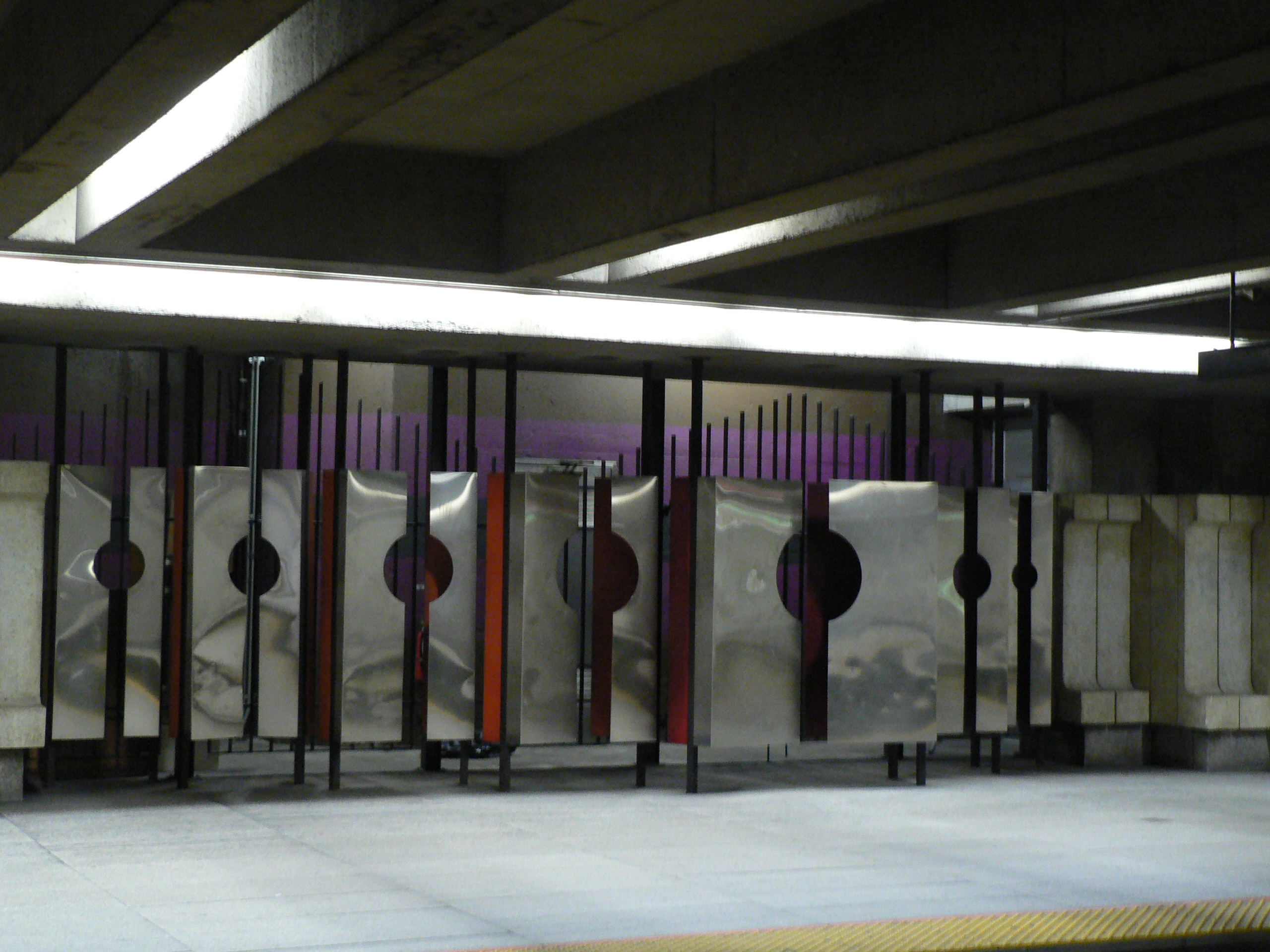 Charles Daudelin이 제작한 조각 격자무늬가 승강장에 설치되어 환기구를 가리고 있다.