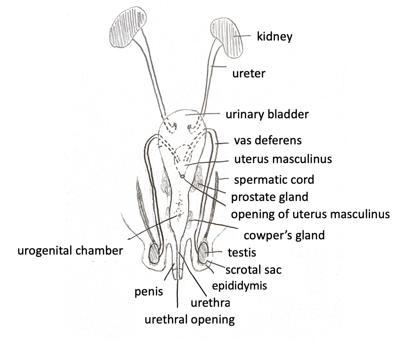 성체 수컷 생식계는 대부분의 포유류와 동일하게 형성되며, 세르톨리 세포가 포함된 세정관 구획과 라이디히 세포가 포함된 부강 구획이 있다.[72] 라이디히 세포는 테스토스테론을 생성하여 성욕[72]을 유지하고 생식 결절 및 음경과 같은 이차 성징을 만든다. 세르톨리 세포는 뮐러관을 흡수하는 항뮐러관 호르몬의 생성을 유발한다. 성체 수컷 토끼에서 음경의 포피는 원통형이며 생후 2개월부터 배출될 수 있다.[73] 음낭은 음경의 측면에 위치하며 고환을 보호하는 부고환 지방 패드를 포함한다. 10주에서 14주 사이에 고환이 내려오고 골반강으로 들어가서 체온을 조절할 수 있다.[73] 또한 고환과 같은 이차 성징은 복잡하며 많은 화합물을 분비한다. 이 화합물에는 과당, 구연산, 미네랄 및 독특하게 많은 양의 카탈라아제가 포함되며,[72] 이 모든 것이 토끼 정액의 특성에 영향을 미친다. 예를 들어 구연산은 응집과 양의 상관 관계가 있으며,[74] 다량의 카탈라아제는 조기 정자 활성화를 방지한다.[75]