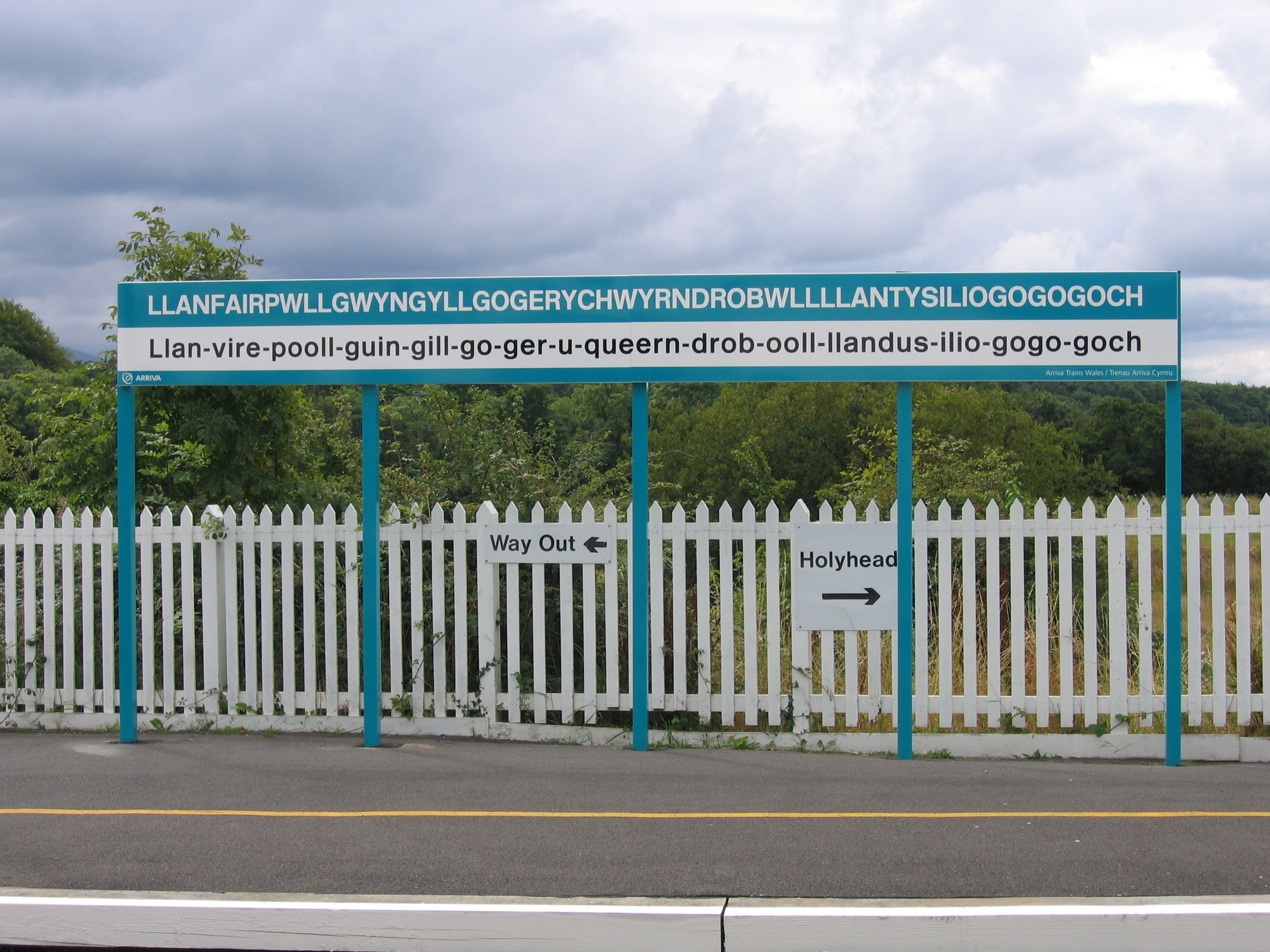 이 긴 이름은 영어 철자로는 58자이지만, 웨일스어에서는 'ch'와 'll'을 각각 하나의 문자로 취급하므로 51자이다. 이는 영국에서 가장 긴 지명이며, 세계에서 가장 긴 지명 중 하나이다.[40] 마을 표지판에는 여전히 Llanfairpwllgwyngyll||cy로 표시되어 있고, 오드넌스 서베이 지도에는 Llanfair Pwllgwyngyll||cy로, 기차역은 공식적으로 Llanfairpwll||cy로 표기되며, 이는 지역 주민들이 흔히 사용하는 형태이다. 웨일스의 다른 Llanfair||cy와 구별하기 위해 Llanfair PG||cy로 축약하기도 한다.