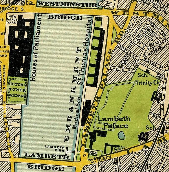 램버스 궁전은 캔터베리 대주교의 거처이며 13세기 초부터 대주교들이 거주지로 사용해 왔다.[22] 궁전의 가장 오래된 부분은 랭턴 예배당과 그 지하 묘지이며, 둘 다 13세기로 거슬러 올라간다. 제2차 세계 대전에서 큰 피해를 입었지만, 광범위하게 수리되고 복원되었다.[22] 궁전의 주요 입구인 모턴 타워는 1490년에 지어졌다.[22] 여러 세기에 걸쳐 재건되었지만 주로 잉글랜드 내전 중 피해를 입은 대강당에는 램버스 궁전 도서관의 방대한 컬렉션이 소장되어 있다.[22] 1833년에 완공된 블로어 빌딩은 대주교를 위한 새로운 개인 거주지이다.[22]4. 3. 앨버트 엠뱅크먼트