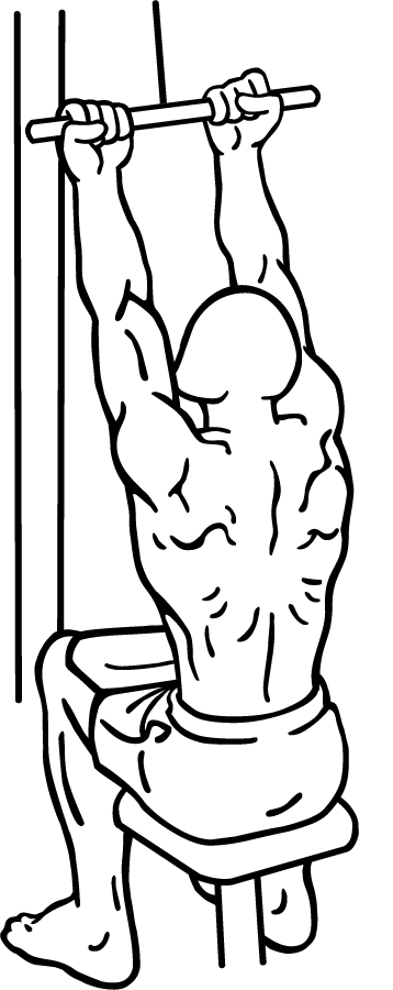 시작 자세 | 머신에 앉아 허벅지를 패드 아래에 위치시키고, 어깨너비보다 약간 넓게 오버핸드 그립으로 바를 잡는다. 팔꿈치를 약간 구부린 상태로 유지하며, 가슴 위쪽을 향해 바를 당긴다. |