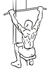 넓은 그립 오버핸드 | 당겼을 때 팔이 90도가 되는 너비로 바를 잡고 가슴 앞(목 바로 아래)으로 당긴다. 상체는 약간 뒤로 기울인다. | 광배근 상부, 대원근. 일반적인 랫 풀 다운 방식. |