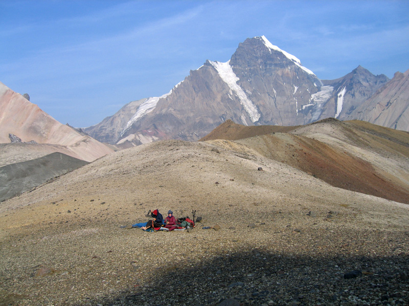 랭겔 산. 정상부의 얼음으로 덮인 칼데라와 푸마롤 활동이 특징이다.
