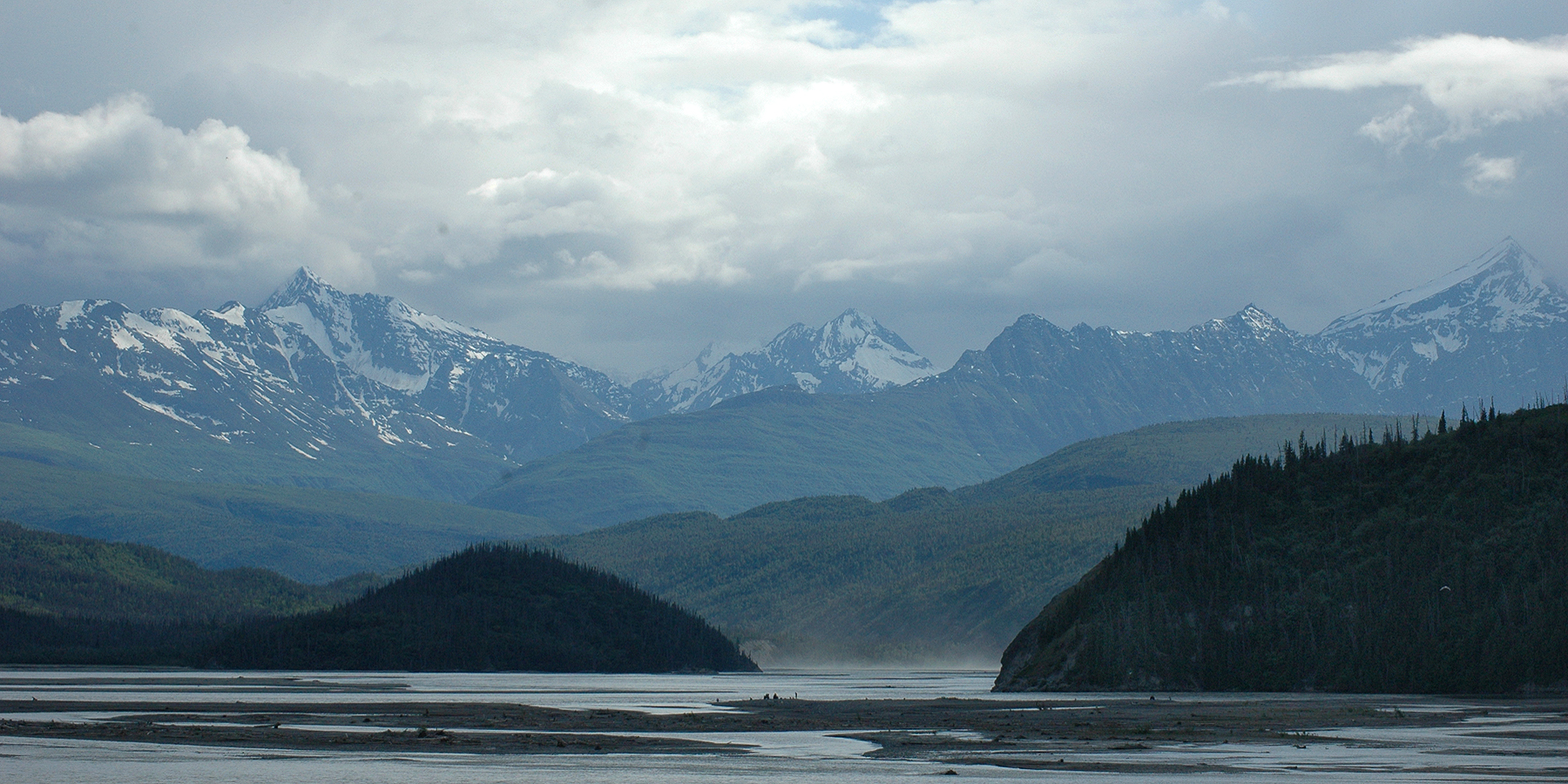 알래스카 남부 지역은 판 이동의 결과로 북아메리카 대륙에 부딪혀 온 여러 지괴들로 이루어져 있다. 태평양판북아메리카판에 대해 연간 약 5.08cm에서 약 6.35cm의 속도로 북서쪽으로 이동하며,[29] 알래스카 만에서 대륙 지괴와 충돌한다. 이 과정에서 태평양판은 알래스카 지괴 아래로 섭입하면서 대륙의 암석을 압축시켜 여러 산맥을 형성했다. 태평양판 위에 실려 온 지괴나 섬 호들은 알래스카 지괴와 충돌하며 압축되고 접히지만, 지구 내부로 완전히 들어가지 않고 대륙 가장자리에 부착된다. 이러한 과정을 통해 랭겔리아 복합 지괴와 그 뒤를 이은 서던 마진 복합 지괴(보더 산맥 단층계 남쪽)가 알래스카 남쪽 해안에 형성되었다.[30] 섭입 작용의 부산물로, 섭입대에서 약간 떨어진 내륙 지역에는 화산이 만들어지기도 한다.[31] 현재는 야쿠타 지괴가 비슷한 밀도의 다른 지괴 아래로 밀려 들어가면서 융기와 함께 부착과 섭입이 복합적으로 일어나고 있다. 사실상 알래스카 대부분 지역이 북아메리카 대륙에 부착된 지괴들로 구성되어 있다.[32]