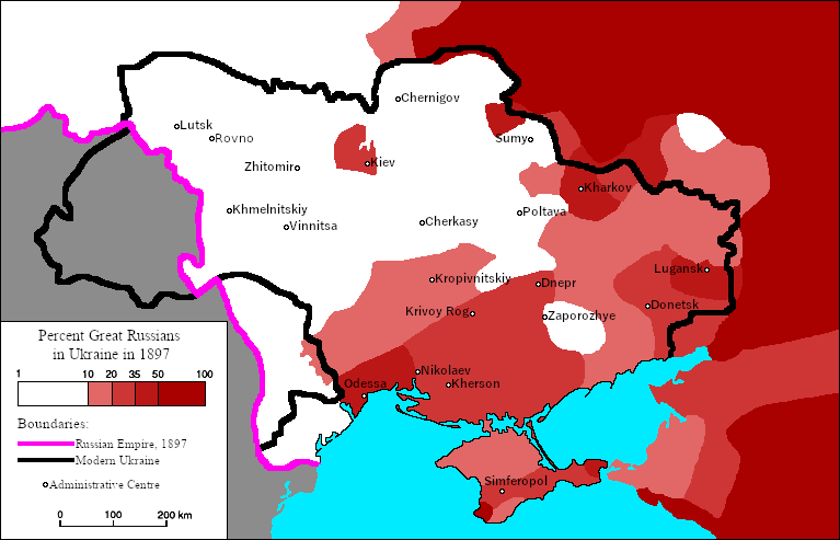20세기 초, 러시아인은 우크라이나 내 여러 주요 도시에서 가장 큰 민족 집단을 형성했다. 당시 러시아인이 다수를 차지했던 주요 도시는 다음과 같다.[5]