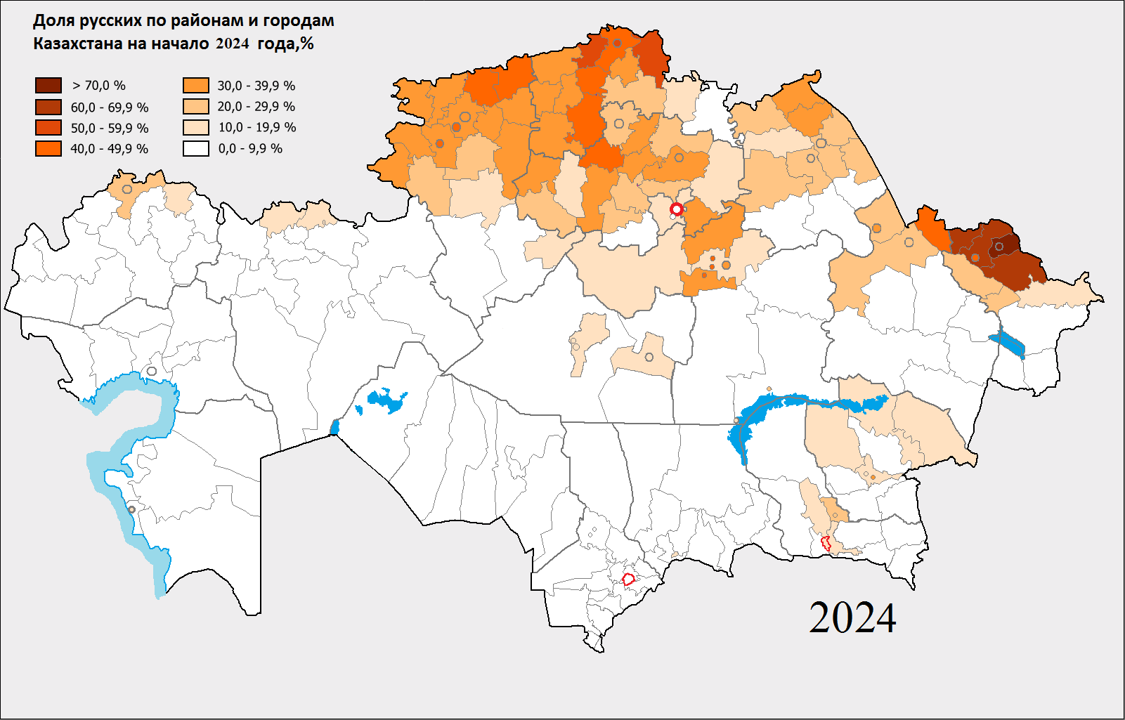 2024년 기준 러시아계가 가장 큰 집단을 차지하는 카자흐스탄의 구역