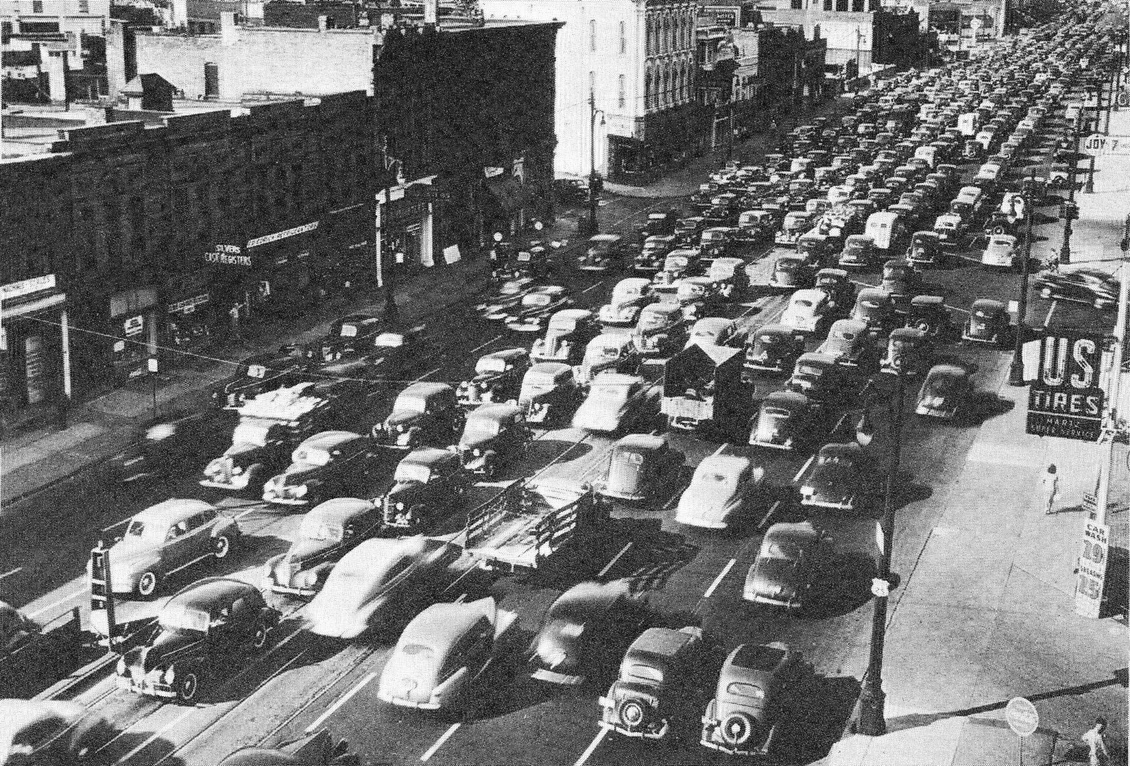 - 교통 체증 심화: 자가용 이용 증가로 인해 출퇴근 시간이 길어지고, 물류 비용이 증가하는 등 사회 전체적으로 큰 손실이 발생한다.[32] 특히, 도로는 철도보다 교통 수용량이 작아 러시아워 시간대에 교통 체증이 더욱 심각하다.