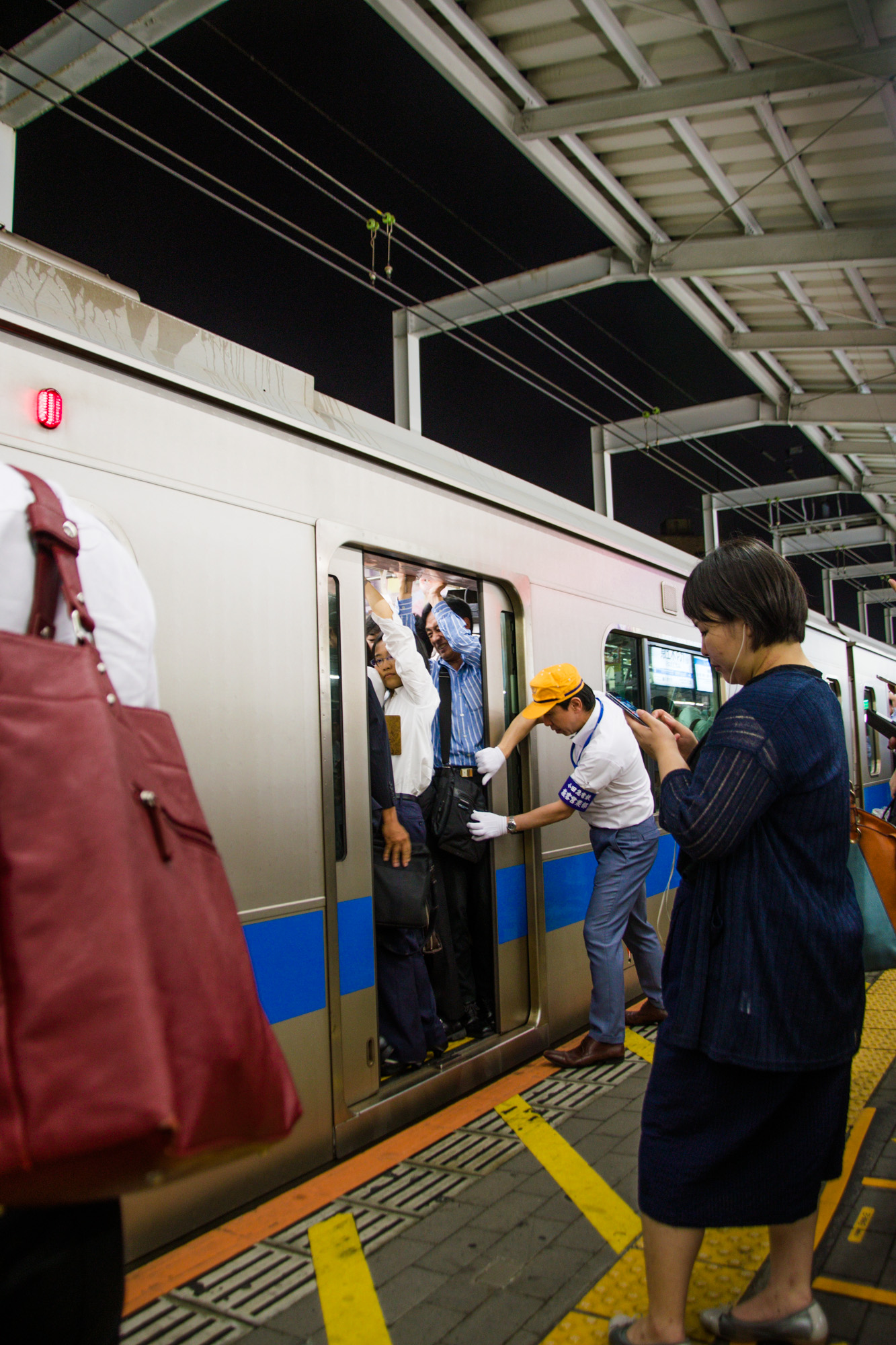 고도 경제 성장기 일본 철도(특히 도쿄 대도시권)는 승차율 300%를 넘는 "만원", "통근지옥", "살인적인 혼잡"으로 평가받았다. 신주쿠역 아침 러시는 세계적으로 유명했고, '오시야'라는 직원이 승객을 밀어 넣었다. 2005년 도큐 덴엔토시선에서 노트북 컴퓨터 내압성 테스트 결과 100kg 압력을 기록했다.[23][24]