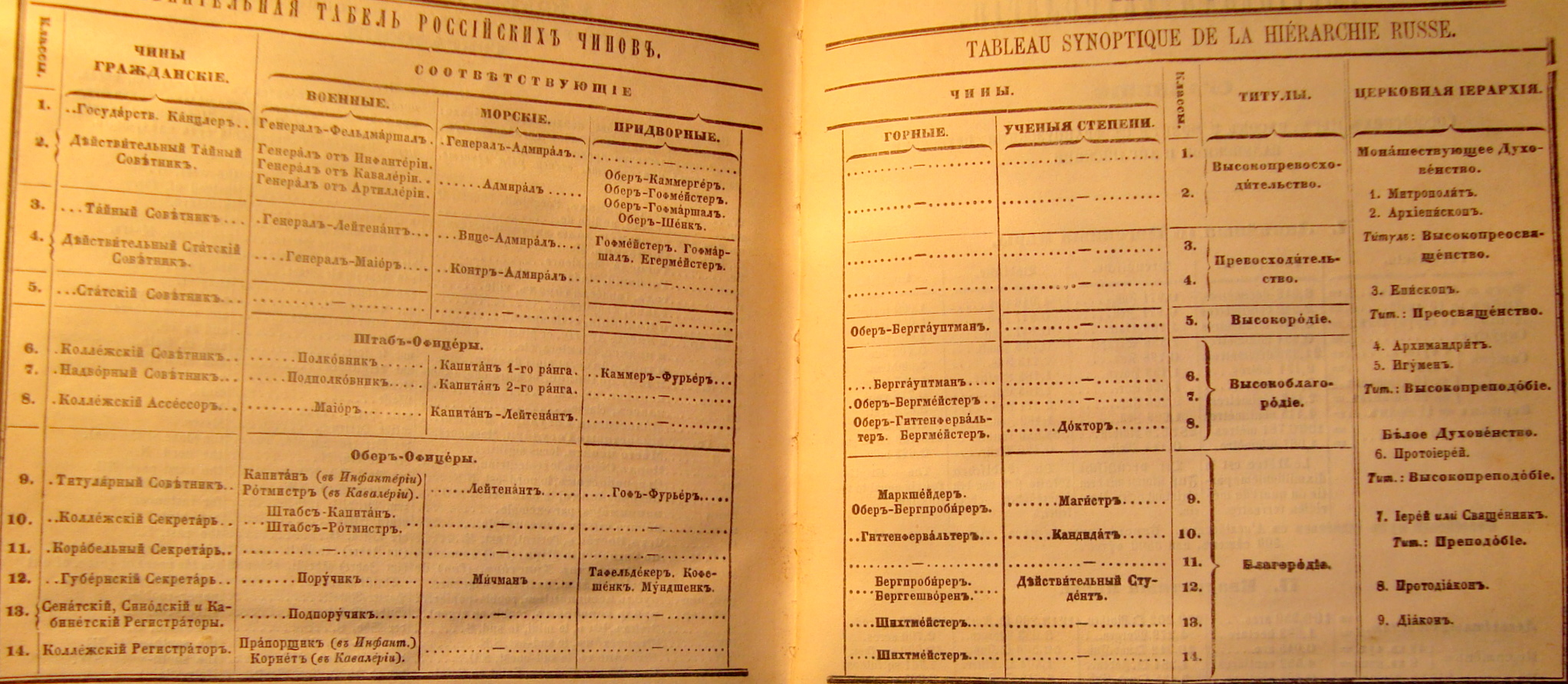 러시아 제국의 정부, 궁정, 군대 및 성직자 계급은 러시아 제국의 젠트리 계급을 대표하는 방식이었다. 귀족 작위와 마찬가지로, 각 계급 보유자는 고유한 경칭을 사용했다.[9]계급 | 문관, 궁정 및 군 계급 | 성직자 계급 | 계급 | |||