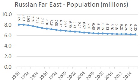 러시아 극동의 인구는 소련 해체 이후 급격히 감소하는 추세를 보였다. 이는 러시아 전체의 인구 감소율보다 더 심각한 수준으로, 지난 15년 동안 14%가 감소했다는 기록도 있다. 러시아 제국을 계승한 소련은 극동 개발을 중시했으나, 1991년 소련 붕괴 당시 806만 명이었던 인구는 러시아 연방 출범 초기의 경제 침체와 사회 혼란 속에서 크게 줄어들었다. 2002년 전러시아 인구 조사에서는 6,692,865명, 2016년 조사에서는 약 620만 명으로 집계되었다. 러시아 정부는 인구 감소를 막기 위해 여러 재정착 프로그램을 논의했으며, 특히 근방 국가에 거주하는 러시아인을 유치하려 했으나, 결과적으로는 우크라이나 출신 이민자를 재정착시키는 방안을 추진하기도 했다.