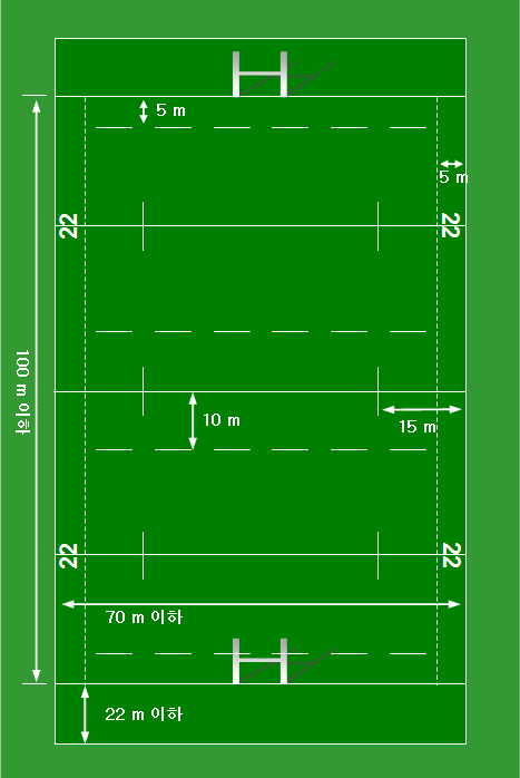 - 경기 구역(Playing Area): 실제 경기가 주로 이루어지는 곳으로, '필드오브플레이'(Field of Play)와 양쪽의 '인골'(In-goal) 영역을 포함한다.