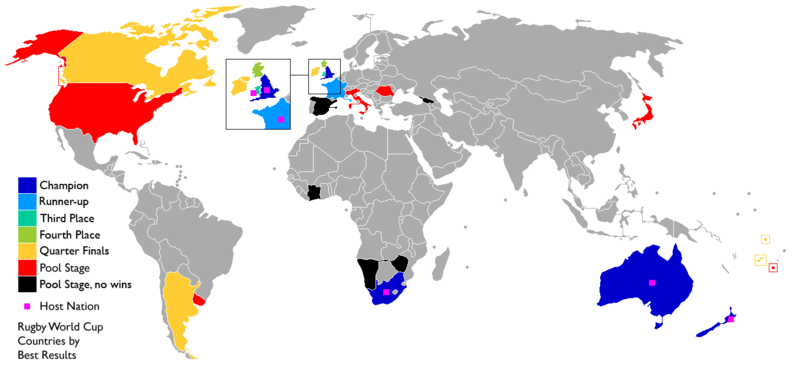 럭비 유니온 최고의 대회인 럭비 월드컵은 프로화 이전인 1987년 오스트레일리아와 뉴질랜드에서 처음 개최되었으며, 뉴질랜드가 초대 우승을 차지했다.[171] 럭비 월드컵은 4년마다 열리며 우승팀에게는 웹 엘리스 컵이 수여된다. 한편, 더 적은 인원으로 빠르게 진행되는 럭비 세븐스 역시 인기를 얻으며 국제적인 스포츠로 자리 잡았다. 1993년 스코틀랜드 머레이필드 스타디움에서 첫 럭비 월드컵 세븐스 대회가 열렸고,[171][274] 1998년부터는 코먼웰스 게임 정식 종목으로 채택되었다.[171] 나아가 2016년 리우데자네이루 올림픽부터 하계 올림픽 정식 종목으로 포함되었으며,[171][361] 2020년 도쿄 올림픽에서는 남녀 세븐스 경기가 모두 열렸다.[39]