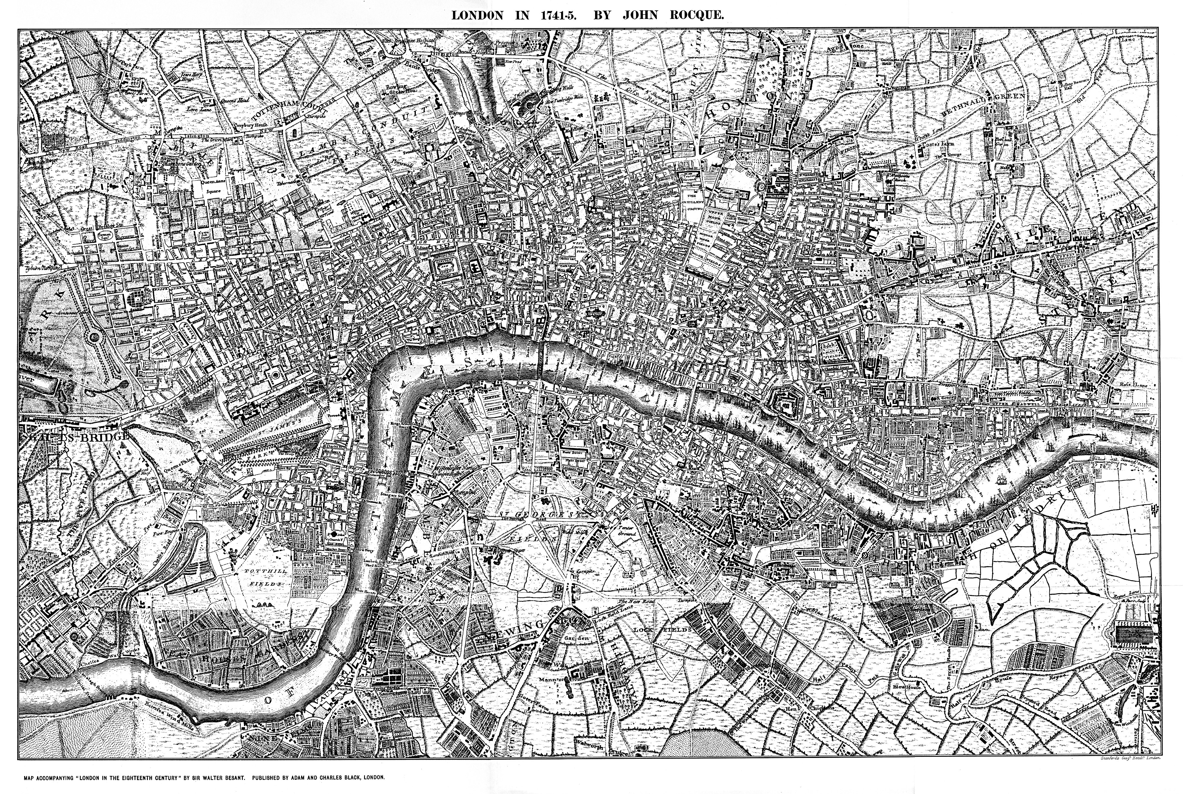 조지 왕조 시기 런던은 옛 경계선 너머로 팽창하면서 가속도가 붙었다. 이는 존 로크가 1741~45년에 그린 지도와 1746년에 그린 지도에서 잘 드러난다. 웨스트엔드에 거주하던 부유층을 위해 메이페어 등의 새로운 지구가 조성되었고, 템스강에 지어진 새 다리로 사우스런던과 이스트런던 지역의 개발도 가속화되었으며, 런던항은 런던시로부터 하류 쪽으로 연장되었다.[117]