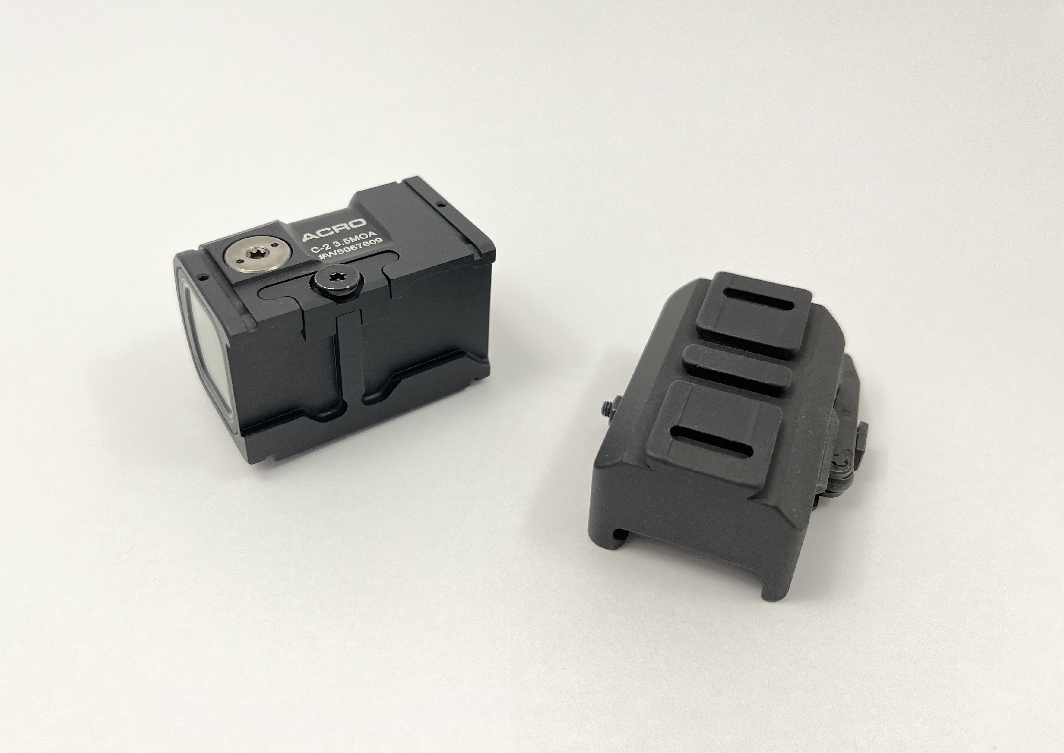 - Aimpoint Acro 레일: 2019년에 Aimpoint Acro P-1 및 C-1 조준경과 함께 출시되었다.[16] 클램핑 메커니즘을 통해 조준경을 부착하기 위한 dovetail rail이며, 폭 4 mm[17]의 직선 반동 러그 홈이 있다. 권총뿐만 아니라 소총과 샷건에도 사용할 수 있을 만큼 컴팩트하다. 도브테일은 약 16.5 mm 너비이며 날카로운 모서리가 없도록 곡면 처리되어 있다.