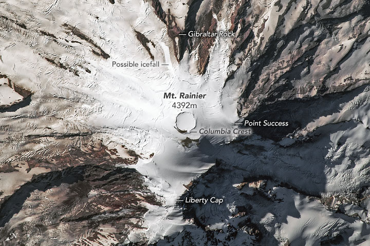 레이니어산의 넓은 정상부에는 세 개의 봉우리가 있다. 가장 높은 봉우리는 컬럼비아 크레스트(Columbia Crest)이고, 두 번째로 높은 봉우리는 포인트 석세스(Point Success, )이며, 가장 낮은 봉우리는 리버티 캡(Liberty Cap, )이다.[40]