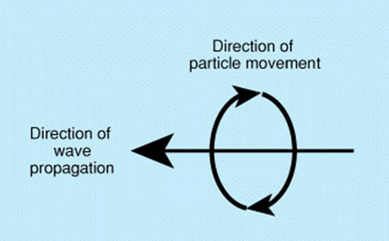 등방성 고체에서 레일리파는 표면에 수직이고 전파 방향과 평행한 평면에서 표면 입자가 타원으로 이동하게 한다. 타원의 장축은 수직이다. 표면과 얕은 깊이에서 이 움직임은 ''역진''한다. 즉, 파동이 왼쪽에서 오른쪽으로 이동할 때 입자의 평면 내 움직임은 시계 반대 방향이다. 더 깊은 곳에서는 입자 운동이 ''진행''된다. 또한 재료의 깊이가 증가함에 따라 운동 진폭이 감소하고 이심률이 변경된다. 고체에서 유의미한 변위의 깊이는 음향 파장과 대략 같다. 레일리파는 러브파나 램파와 같은 층에 의해 지원되는 유도파, 또는 벌크에서 이동하는 종파 및 전단파와는 구별되는 다른 유형의 표면 또는 유도 음향파이다.