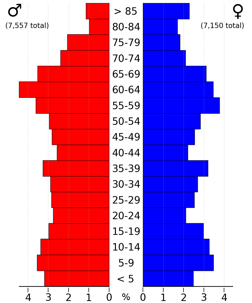 연령별로는 18세 미만이 26.50%, 18세에서 24세가 6.60%, 25세에서 44세가 25.30%, 45세에서 64세가 21.70%, 65세 이상이 19.80%였다. 중앙 연령은 40세였다. 여성 100명당 남성은 99.30명이었고, 18세 이상 여성 100명당 남성은 98.50명이었다.