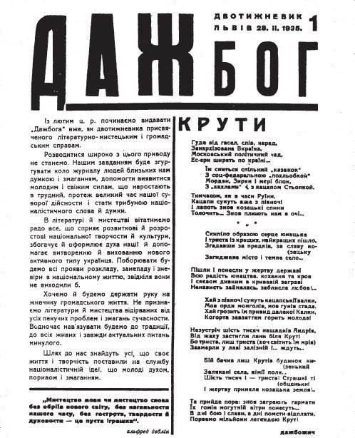1930년대에 우크라이나에서 슬라브 토착 신앙의 첫 번째 실천자들이 나타났다. 1931년부터 1935년까지 발행된 우크라이나 문학 잡지 ''Dazhboh''는 신이교 사상으로 가득했다.[8] 가장 영향력 있는 우크라이나 로드노베르 이데올로그 중 한 명은 리비우 대학교에서 일한 언어학자이자 문헌학자인 볼로디미르 샤이안 (1908–1974)이었다. 그는 1934년에 카르파티아 산맥의 그레키트 산 정상에서 영적인 계시를 받았다고 주장했다. 당시 유행했던 고대 아리안 인종에 대한 아이디어에 특히 관심이 많았던 그는 이후 소위 "범 아리안 르네상스"를 홍보하기 시작했다. 그는 고대 슬라브 종교의 생존물로 여겨지는 것을 찾기 위해 기록된 우크라이나 민속을 연구했다. 1944년, 그는 소련 정부를 피해 독일과 오스트리아의 난민 캠프로 갔으며, 그곳에서 제2차 세계 대전 동안 우크라이나 반군 군대에 가입하기를 희망하는 종교 정치 단체인 태양신의 기사단 (''Orden Lytsariv Boha Sontsia'')을 설립했다.