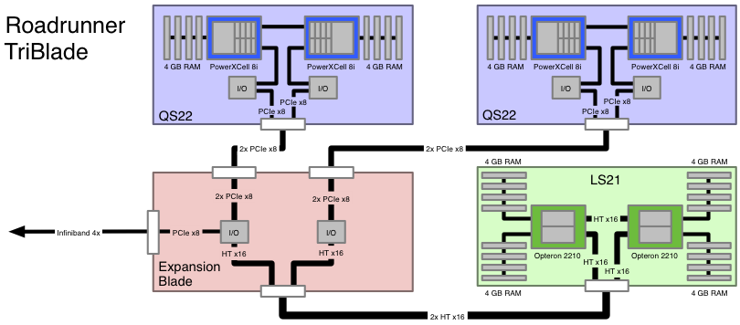 논리적으로 '''TriBlade'''는 16 GB RAM을 갖춘 2개의 듀얼 코어 옵테론과 16 GB Cell RAM을 갖춘 4개의 PowerXCell 8i CPU로 구성된다.[16]